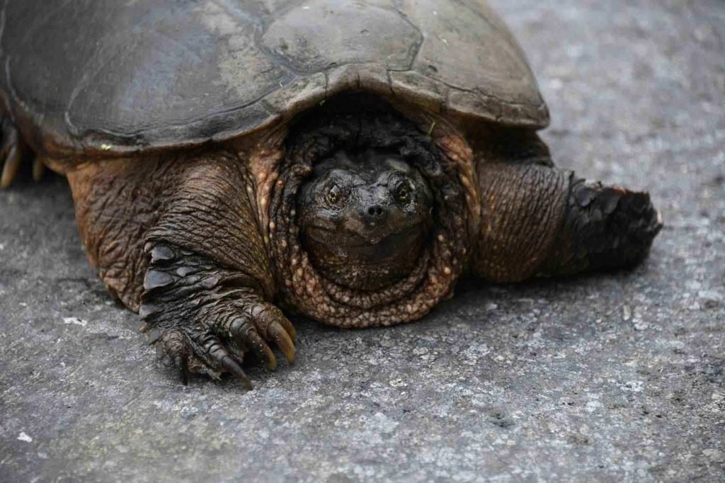 - Snapping turtle (Chelydra serpentina). 8 to 12 inches long with large head and long saw-toothed tail. Carapace rough and keeled, plastron small. Very bad tempered. Lives in ponds - here found only in the beaver pond. Eats invertebrates, fish, reptiles, birds, mammals, carrion, and some vegetable matter. Usually innoffensive in the water, if approached on land will accept donations of a finger. Generally found only when it comes ashore to lay eggs because it rarely basks on rocks or logs.