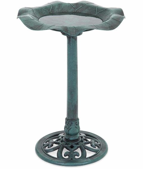 This is an excellent solution for anyone who’s looking for a simple, affordable option that’s still decorative. This resin model by Best Choice Products is decorative and stable, and gives off the appearance of real aged copper or brass. The foundation is made up of a beautiful lattice design and the bowl has a wavy design that looks more like a leaf. The price is right, and this bird bath comes in gold or green.