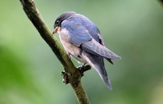 The House Martin is a little more distinctive. Its upper body is a metallic blue-black, like the Swallow, and its underbelly is white; however, its white rump distinguishes it from the Swallow. Like the Swallow and Swift, its tail is forked, but the fork is smaller than that of the Swallow.